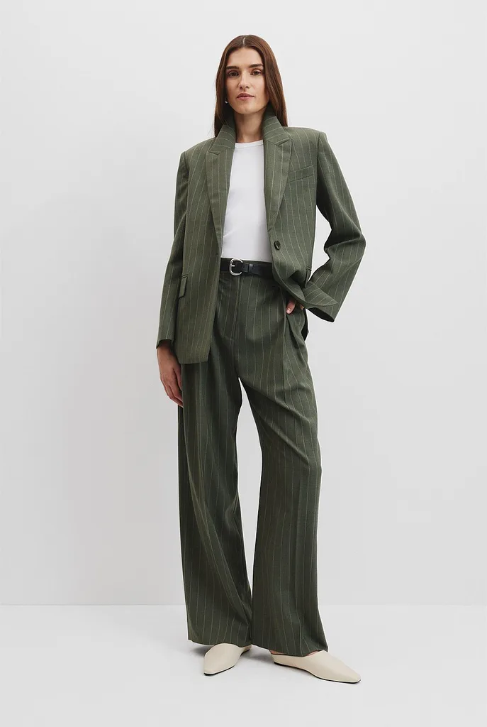 We love the structured look of this double-breasted blazer with strong peak lapels in a versatile earthy tone. Dress it up with matching pants and statement earrings, or pair it with black wide-leg pants to allow the blazer to stand out.