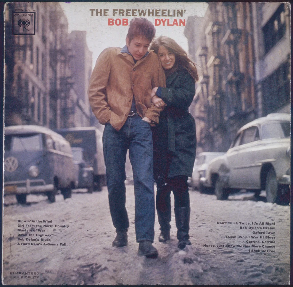 The cover of the Freewheelin’ album is as iconic as the songs. We see Bob and Suze, arm in arm, walking down a snow-covered 4th Street just near their apartment. As Suze noted, Bob was in fact freezing because he preferred the look of his light suede jacket to something more weather-appropriate. Inexplicably, she wrote that “every time I see that picture I think I look fat”.